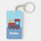 Une illustration mignonne et colorée d'un train dans des couleurs primaires de jaune, de rouge et de bleu avec les rayures verticales bleu-clair pour l'arrière - plan. Pour les garçons qui aiment des trains de jouet et rayer des voies de chemin de fer, ils aimeront ce porte - clé personnalisé dans leur nom.