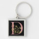 Lettre D rose pailletée avec des feuilles dorées et des volutes en surimpression et un papillon cuivré sur fond noir.