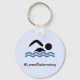 Un keyring avec un slogan amusant, pour tous ceux qui aiment nager. Texte simple en noir avec un coeur rouge, et image stylisée d'un nageur, sur un arrière - plan bleu pâle. #LoveSwimming