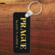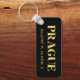 Un porte-clés en métal Lux présentant les coordonnées de latitude et de longitude de Prague, en République tchèque, en caractères dorés sur fond noir.