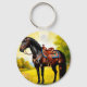 Un cheval noir saisissant orné d'une selle colorée, debout avec grâce contre un fond de campagne vibrant avec des fleurs en fleurs et une lumière chaude du soleil, évoquant un sentiment de liberté et de tranquillité.