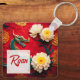 Dragon chinois en 3D image numérique avec des pivoines blanches devant un arrière - plan décoré (modèle n°2) + idéogramme de dragon chinois jaune et or "Année du Dragon". Conception sur porte - clé Carré avec monogramme ou prénom pour personnaliser à l'arrière. Carte de voeux, carte postale, autocollant et plus encore...