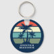 Jolie maison de plage familiale d'été porte - clé avec de beaux palmiers devant un joli coucher de soleil sur l'océan et le ciel bleu. Customisez pour une location de vacances à l'île ou une excursion balnéaire tropicale.