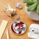 Ce porte - clé métallique à thème volleyball présente l'image réaliste d'un volleyball marron, gris et blanc, sur lequel vous pouvez customiser le nom du joueur et le numéro de maillot dans une police de style lettre variée - par katz_d_zynes