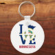 L'amour du Minnesota. Minnesota en majuscules rouges le avec le mot aimé rempli avec le drapeau de l'état. La lettre O en amour est la silhouette avec le contour de l'état du Minnesota.