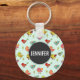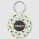 Un porte - clé avec un motif d'oiseaux lunaires dessinés à la main. De mignons petits pins verts les séparent. Cercle noir superposé avec un nom personnalisé à l'intérieur.