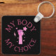 Show your support for women's rights with this keychain design featuring a pink raised fist in center with "my body my choice" text.