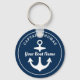 Le design de porte - clé nautique rond est simple et élégant, de style marin bleu et blanc côtier, avec un accent d'ancre de bateau. Personnalisez le texte personnalisé avec le nom du propriétaire du bateau et du bateau / capitaine, l'emplacement, ou d'autres termes préférés.