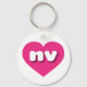 Ce porte - clé est doté d'un coeur rose chaud et vibrant contenant les lettres coques inférieures arrondies et blanches audacieuses nv, une abréviation ludique pour l'état du Nevada, l'état argenté.