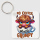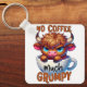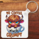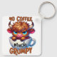 A funny and sarcastic colorful design showcases an adorable highland cow perched in an empty coffee cup. With a grumpy expression, big blue eyes, and brown fur, the cow adds a charming touch. The vibrant text reads, "No coffee much grumpy." This design is featured on a variety of products, making it a perfect gift for coffee enthusiasts.
