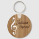 Note de musique graphique en clef blanche triplée imprimée sur des grains de faux bois, avec son nom.