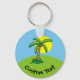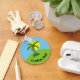 Cartoon illustration of a palm tree. Custom background color. Custom text on both sides.