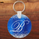 Elégante parties scintillant argentée avec étincelles contre un faux cobalt ou une image graphique en feuille de métal brossé bleu royal. Le chic monogramme de calligraphie blanc au centre peut être customisé. Par exemple, vous pouvez ajouter un nom dans cette même police ou peut-être dans Great Vibes. Tous les éléments brillants et brillants de ce design girly moderne sont des graphismes numériques. Un précieux cercle monogrammé forme porte - clé fête favorise pour sa fête d'anniversaire spéciale.