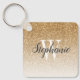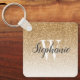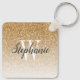 Ce porte-clés chic présente un arrière - plan de parties scintillant à l'ombre dorée. Customisez-le avec votre initiale en police serif blanche et votre nom en script de brosse gris foncé de style écriture manuscrite.
