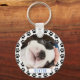 Porte - clé noir et blanc personnalisable qui peut être entièrement personnalisé avec le nom et l'image de votre animal de compagnie. Design empreinte de patte monochrome moderne avec texte bleu. Un cadeau unique idéal pour le propriétaire de l'animal de compagnie dans votre vie.
