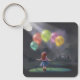 Une petite fille mignonne portant une chemise rose et une jupe bleue tient cinq ballons colorés. Elle apporte une tache de luminosité à un monde sombre. Au loin se trouve un bâtiment gris entouré de brume, d'arbres sombres et de montagnes.