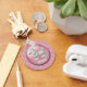 Cute poodle key chain done in a pink, with a white criss cross pattern. Graphics of a large pink button, in the middle, has an adorable fluffy white poodle, and white custom text. Personalize the text to read what ever you want. Makes a great gift idea.