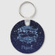 Keychain featuring the zodiac symbol for Pisces in soft silver blue, overlaid with the stars of the constellation, against a starry sky background graded from deep midnight blue to black.