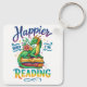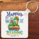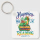 Design coloré et dynamique, avec un livre ouvert, un dragon coloré et des fleurs. Le texte coloré dit : "Plus heureux quand je lis". Ce design est disponible sur une grande variété de produits.