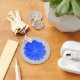 Ce joli porte - clé présente une photo d'une fleur de marigold manipulée pour en faire une étonnante couleur bleu vif. La fleur est assise sur un arrière - plan gris.