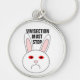 Ce porte - clé présente le triste visage d'un lapin blanc. Ce lapin a une grosse fronde sur son visage parce qu'il est un lapin de laboratoire qui a fait l'objet de tests cosmétiques. Les blancs de ses yeux sont rouges et enflés. Le design a été conçu pour attirer l'attention sur les souffrances inutiles causées par les tests de cosmétiques sur les animaux. Le texte noir entre les oreilles du lapin dit, "la vivisection doit s'arrêter"