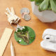 Ce porte - clé époustouflant présente une photo d'un beau papillon tropical. Il a de belles marques vertes irisées sur toutes ses ailes. Il a ses ailes pliées tandis qu'il repose sur quelques feuilles. La photo a été prise en utilisant la macro photographie pour un résultat étonnamment détaillé.