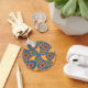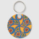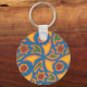 Un Porte - clé élégant avec un motif islamique traditionnel, tiré d'une sérigraphie de Judy Adamson. Les étoiles et les formes géométriques sont en vert, rouge foncé et jaune doré encadrés en orange sur un arrière - plan bleu vif.