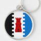 "Par sable pâle et azure, sur un argent bretassy pâle, une tour de gules."