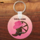 Illustration graphique d'une roue de wagon ouest, casquette de cowgirl et bottes de cowgirl sur un porte - clé de qualité personnalisée. Le porte - clé a un modèle texte pour votre personnalisation. OEuvre originale : Copyright Charmaine Paulson