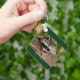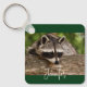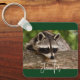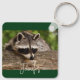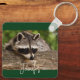 Un porte - clé avec la photo d'un raton laveur mignon et curieux reposant son visage sur un rondelle de bois. Adorable.