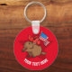 A key chain or key ring, featuring a patriotic red cardinal bird carrying the stars and stripes, astride his stoical groundhog steed, on a five-pointed star background. Change the default text to the name or message of your choice. This cartoon was inspired by some friends on an American adventure and features two of the critters that visited their Washington DC back yard.