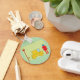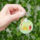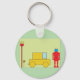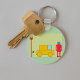 Un robot à l'allure rétro se tenant à côté d'une voiture jaune. Cette conception semble vraiment efficace sur ce Porte - clé
