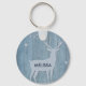 Porte - clé avec un arrière - plan en faux bois de couleur bleue. Le dessus est recouvert d'une silhouette de renne avec de gros bois.