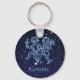 Porte - clé avec le symbole zodiaque pour Gemini en bleu argenté doux, recouvert d'étoiles de la constellation, contre un arrière - plan ciel étoilé classé de bleu nuit profond à noir.