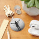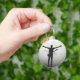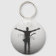 Ce porte-clés circulaire en aluminium présente une silhouette de musicien saisissante en noir et blanc avec les bras tendus et un effet de style glitch unique.