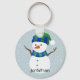 Snowman Design Porte - clé, avec un mignon bonhomme de neige sur un arrière - plan neigeux bleu et texte personnalisable.