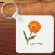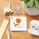 Fleur orange avec gouttes de pluie sur les pétales, tige et feuilles vertes. Le titre "Souci" apparaît en texte courbe en bas.