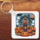 Ready for some spooky vibes with this fun Halloween keychain. On the front is an illustration of a haunted house with bright orange kawaii pumpkins in the garden. Flying around are cute bats and ghosts and i round orange moon. On the back is the text 'Spooky Season Vibes' and a template to add your name to personalize, Ideal for a Halloween treat or just some spooky fun.
