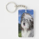Stella est un beau chien de berger anglais gris et blanc avec un regard émouvant et ses longs cheveux soyeux qui flottent au vent, peints par Traci Van Wagoner.