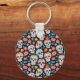 Painted sugar skulls tumble through colorful flowers on this keychain for Dia de Los Muertos.