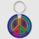 Graphic of a multicolored neon peace sign symbole against a brick wall background
