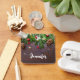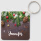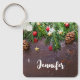 Un porte - clé avec une photo rustique d'une table en bois marron avec des pinecones, des aiguilles de pin, de la neige et des ornements de Noël. Festif et adorable.