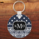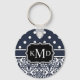 Flourish filigree damask motif et poka dot impression en blanc et bleu marine avec trio personnalisé d'initiales pour votre premier, dernier et le deuxième nom. Joli design tendance à trois monogrammes. Cadeau cool pour les filles qui veulent un cadeau personnalisé qui comprend leurs 3 lettres initiales.