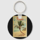 A uniquely retro mid-century modern Tulum Mexico art print in vintage travel poster style. It features a curved palm tree on sandy beach with ocean under a blue cloudy sky.