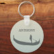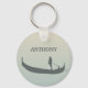 Create a personalized gift with a Venetian style. This keychain has a silhouette style illustration of a gondolier and a gondola in gray set against a sunset colored background of light golden yellow and light blue. Gray lettering is ready to be personalized with a name or other text.