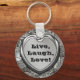 Ces trois mots célèbres : "Live, Laugh, Love" en gras texte noir sur un coeur 3d en argent lisse imprimé en métal qui est sur une paillettes scintillante et scintillante semblent arrière - plans. Un grand dicton inspirant à vivre. Nice pour les mariages, 25ème anniversaire d'argent, Saint-Valentin, fête du Nouvel An et anniversaire, etc. Un porte - clé charmant, amusant et unique pour vous-même ou comme un cadeau pour cette personne spéciale.
