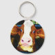 Une vache brune et blanche avec un long visage, de grandes oreilles disquettes et une langue qui sort. Nous l'avons appelé Jethro parce que nous pensons qu'il ressemble à une colline ! Portrait de style Peinture fauviste avec des traits déformés et des coups de pinceau désordonnés.