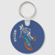 This keychain features my hand drawn illustration of a werewolf skeleton riding a BMX bike. The comic book style graphic is in ivory, aqua blue and orange against a darker blue background. There's a spot to add your name or other custom text. Also works great as a backpack tag. The reverse side has a coordinating blue on blue checkerboard design.