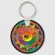 Zodiac Sign Sagittarius Mandala Keychain. An orange, green and rainbow colored mandala with the astrological symbols for zodiac sign Sagittarius the Archer. Symbols for ruling planet Jupiter, the element of fire and the Caduceus symbol of the healer