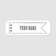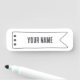 A hand-drawn name tag with a simple flag-style end and subtle dot details on one side.
